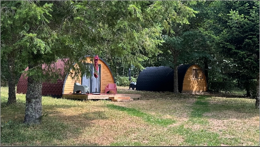 Le long de la lisière du bois se trouvent trois nichoirs en bois (pods) avec une petite cuisine, une chambre avec un lit double, un séjour et des toilettes.